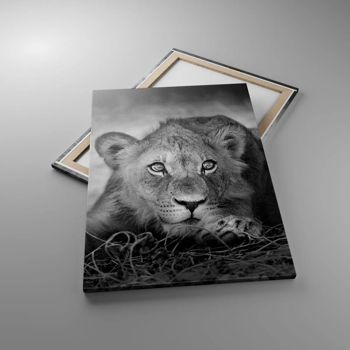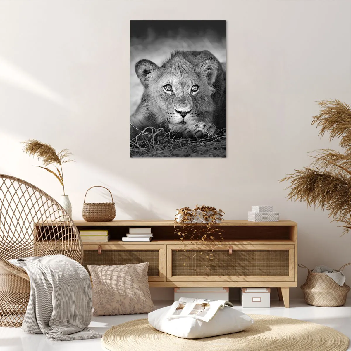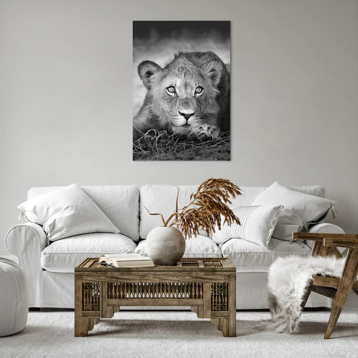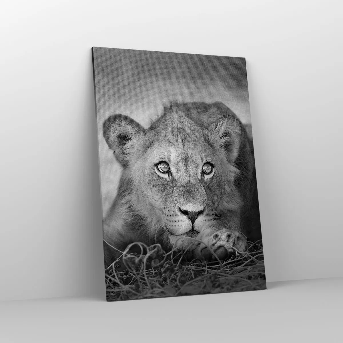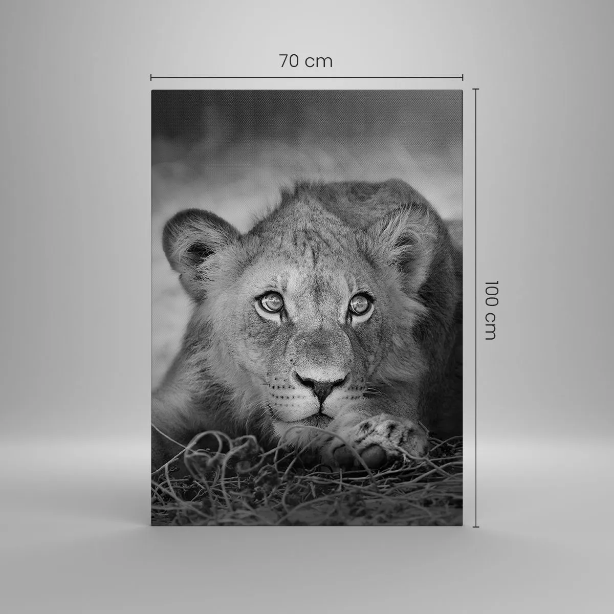 Obraz na płótnie - Monochromatyczny portret leżącego młodego lwa - 70x100cm - Królewskie szczenię - Nowoczesna dekoracja ścienna do salonu i sypialni ARTTOR