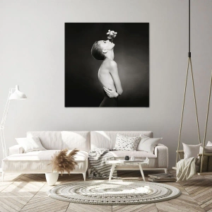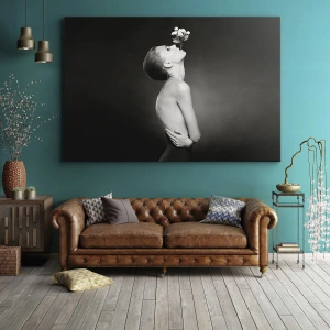 Obraz na płótnie - Czarno-biały portret kobiety z kwiatem unoszonym przez usta - 50x70cm - Ekscentryczna elegancja - Nowoczesna dekoracja ścienna do salonu, kuchni i sypialni ARTTOR