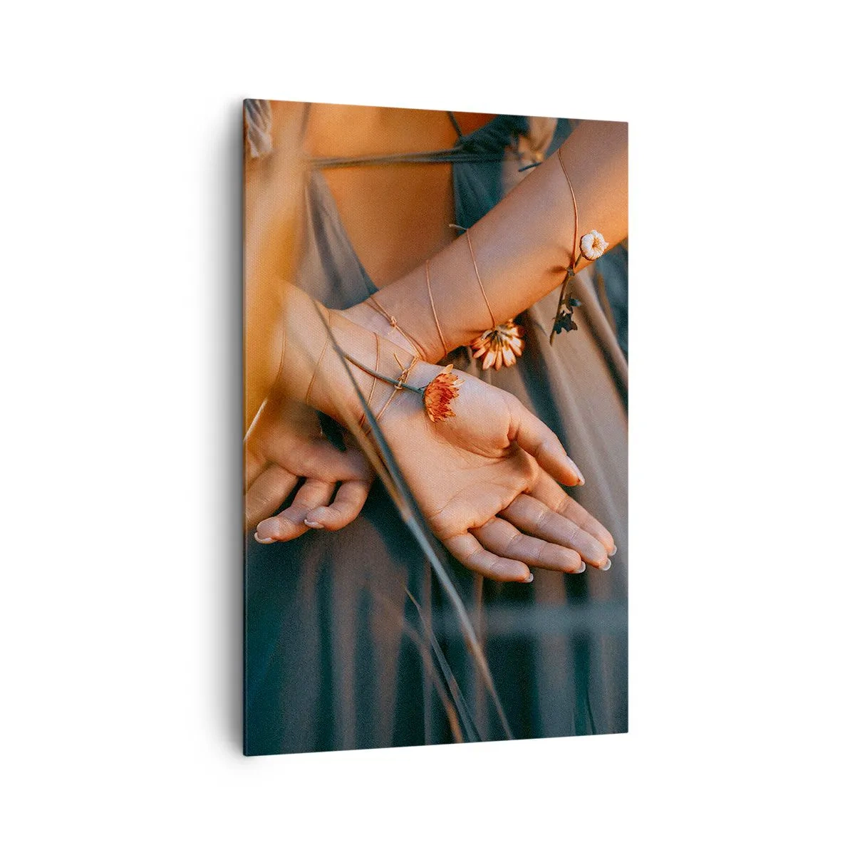 Obraz na płótnie - Zmysłowe dłonie z kwiatami w naturalnym otoczeniu - 80x120cm - Związana z naturą - Nowoczesna dekoracja ścienna do salonu i sypialni ARTTOR