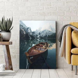 Obraz na płótnie - Drewniana łódka na spokojnym jeziorze otoczonym górami - 50x70cm - Jak na szkle malowane - Nowoczesna dekoracja ścienna do salonu, kuchni i sypialni ARTTOR