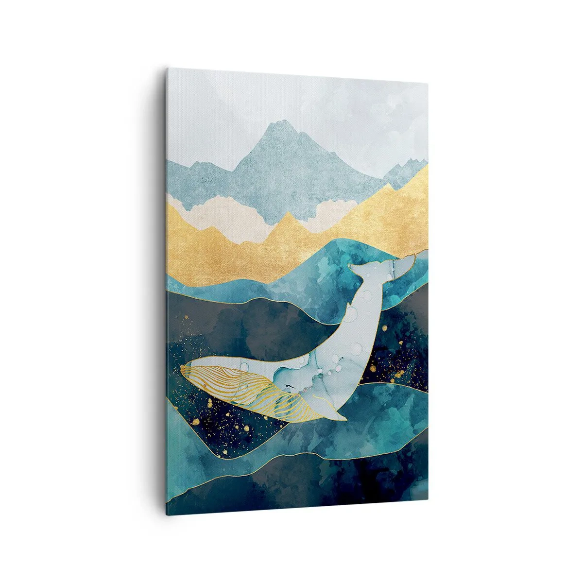 Obraz na płótnie - Abstrakcyjny wieloryb wśród fal i gór w odcieniach błękitu i złota - 80x120cm - Chłodne piękno północy - Nowoczesna dekoracja ścienna do salonu i sypialni ARTTOR