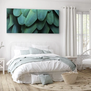 - Obraz ukazuje detal piór w różnych odcieniach zieleni, tworząc harmonijną i nowoczesną kompozycję. Idealny do wnętrz minimalistycznych i tropikalnych, wprowadzając spokój i elegancję.