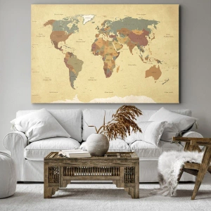 - Stylizowany obraz na płótnie przedstawiający mapę świata w odcieniach beżu i pastelowych kolorów. Idealny do eleganckich wnętrz, łącząc estetykę i funkcjonalność.