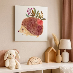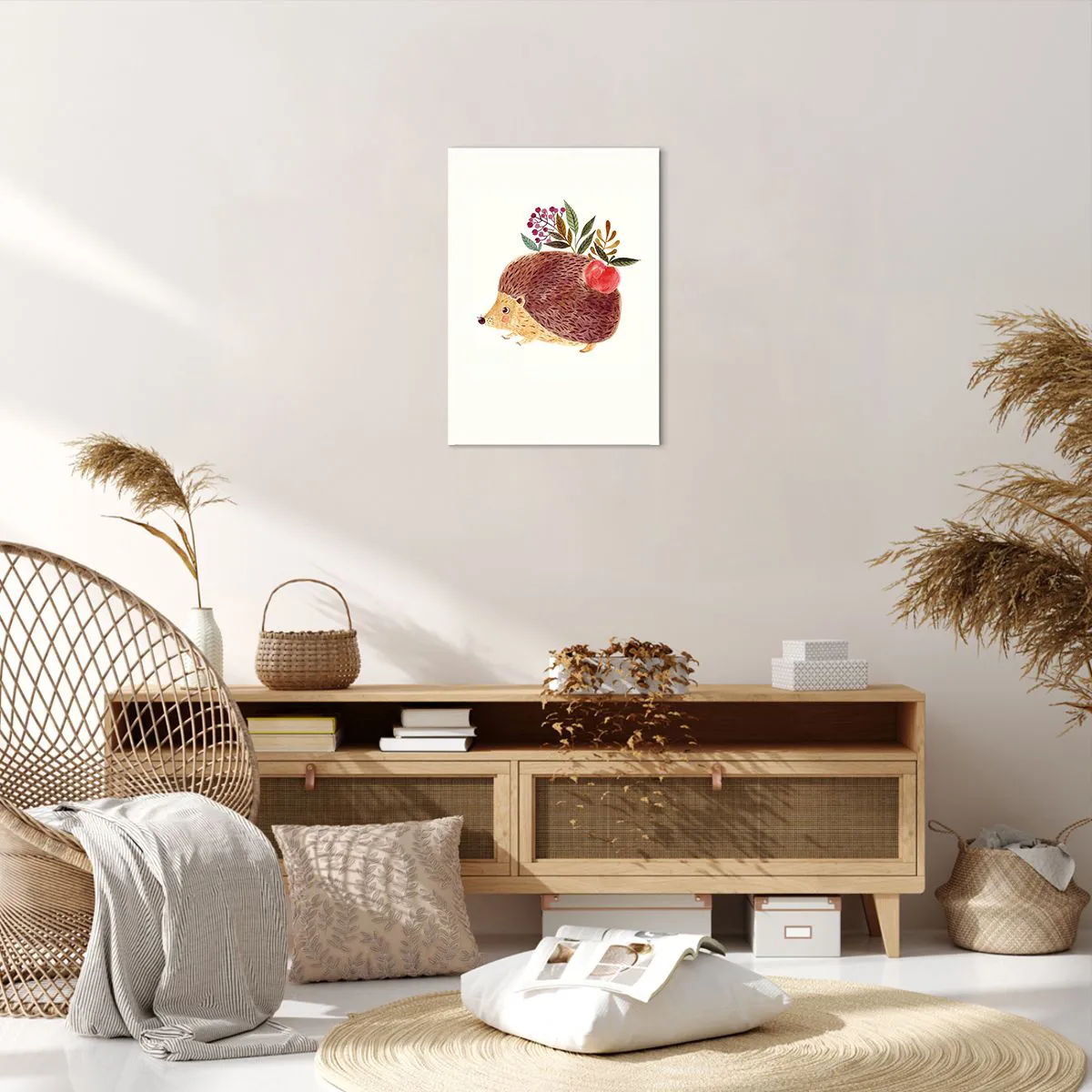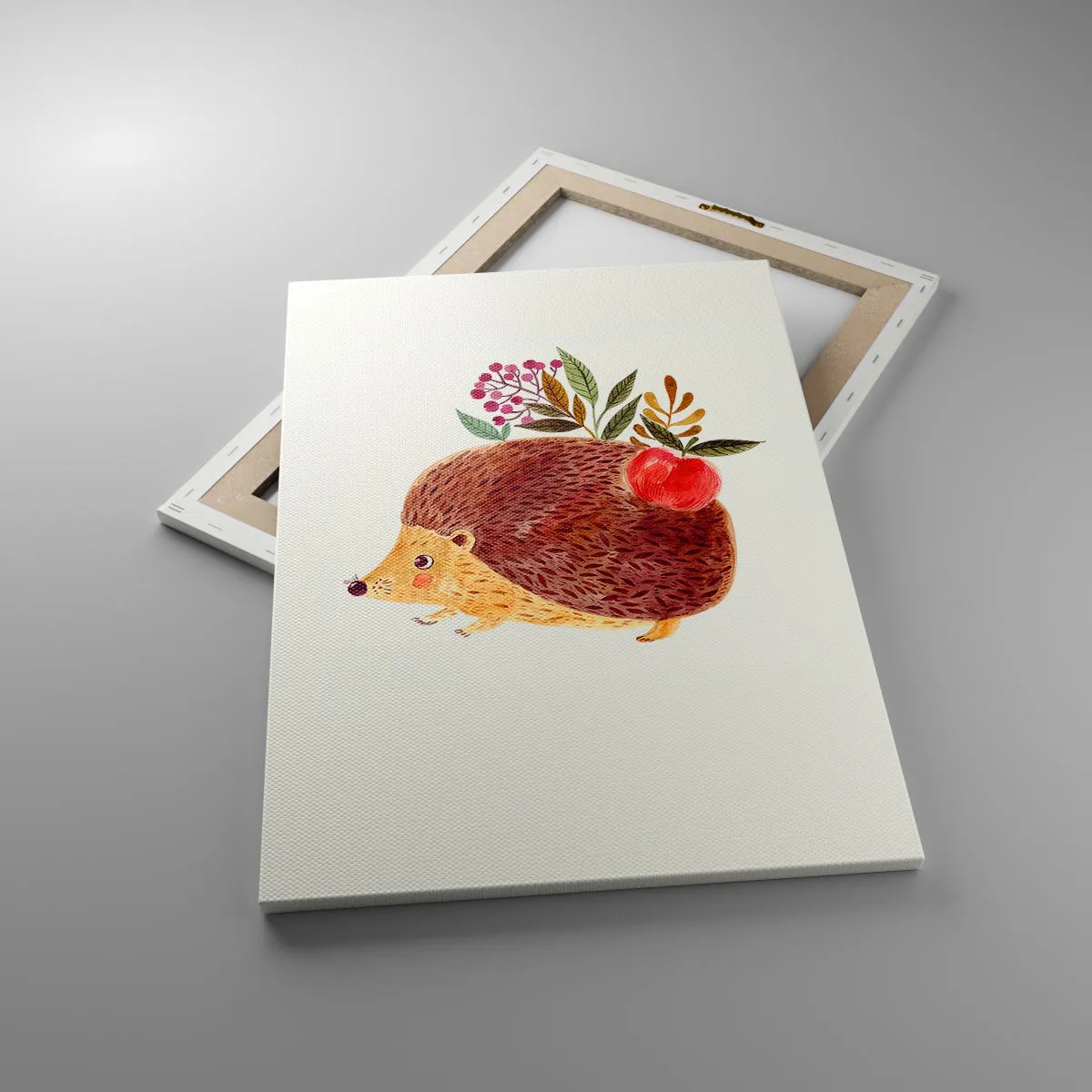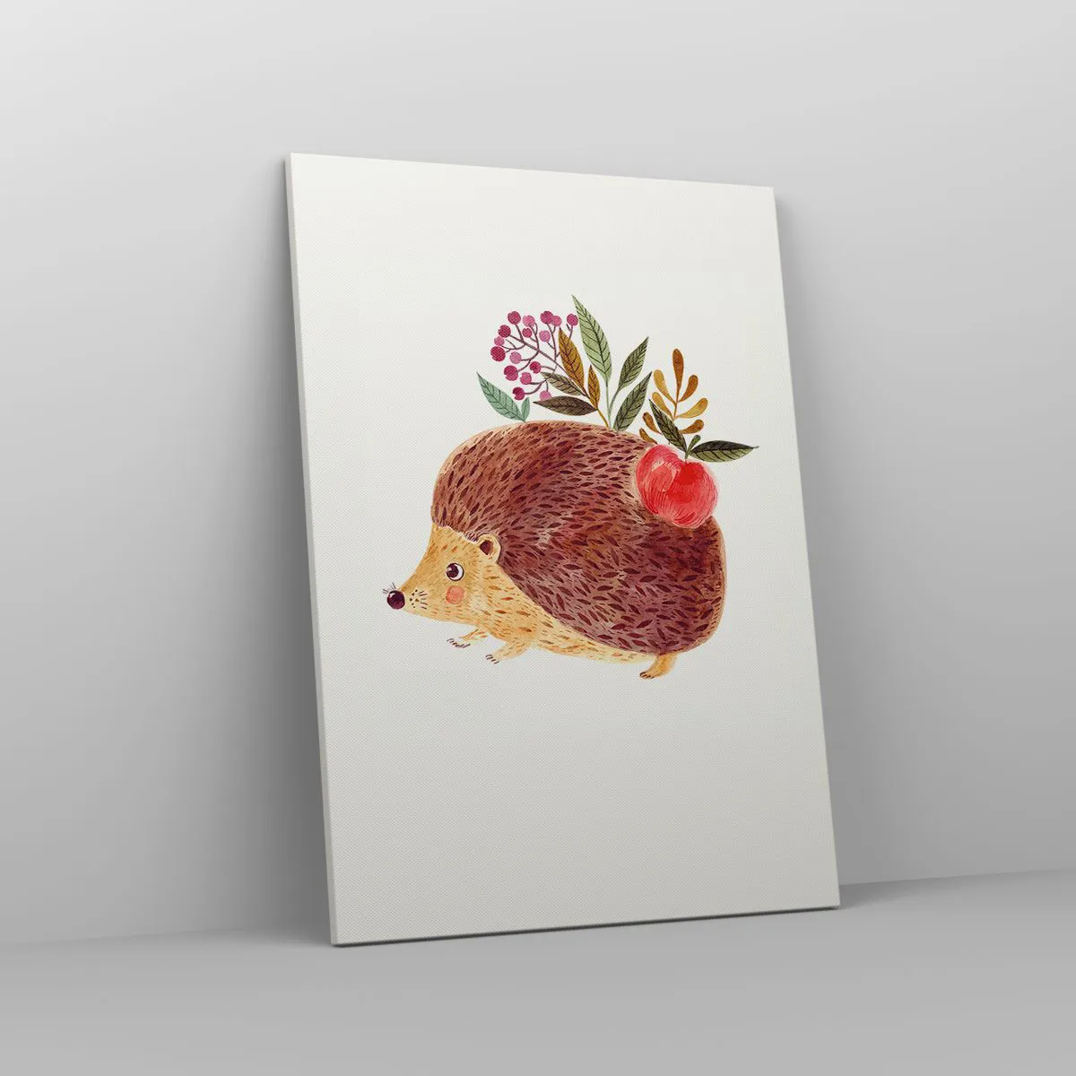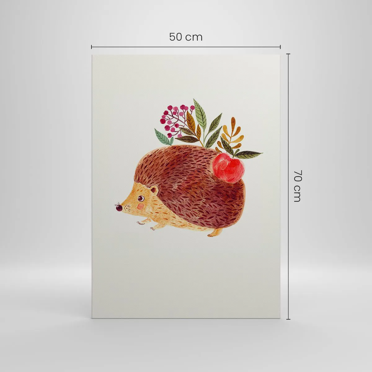 Obraz na płótnie - Urocza ilustracja jeża z jabłkiem i gałązkami na grzbiecie - 50x70cm - I już mnie lubisz - Nowoczesna dekoracja ścienna do salonu, kuchni i sypialni ARTTOR