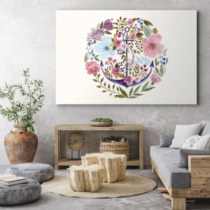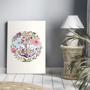 - Obraz w stylu akwarelowym przedstawia kotwicę otoczoną kompozycją kwiatów w pastelowych kolorach. Subtelne detale i marynistyczny motyw tworzą elegancką dekorację, która doskonale uzupełni wnętrza inspirowane naturą i morzem.