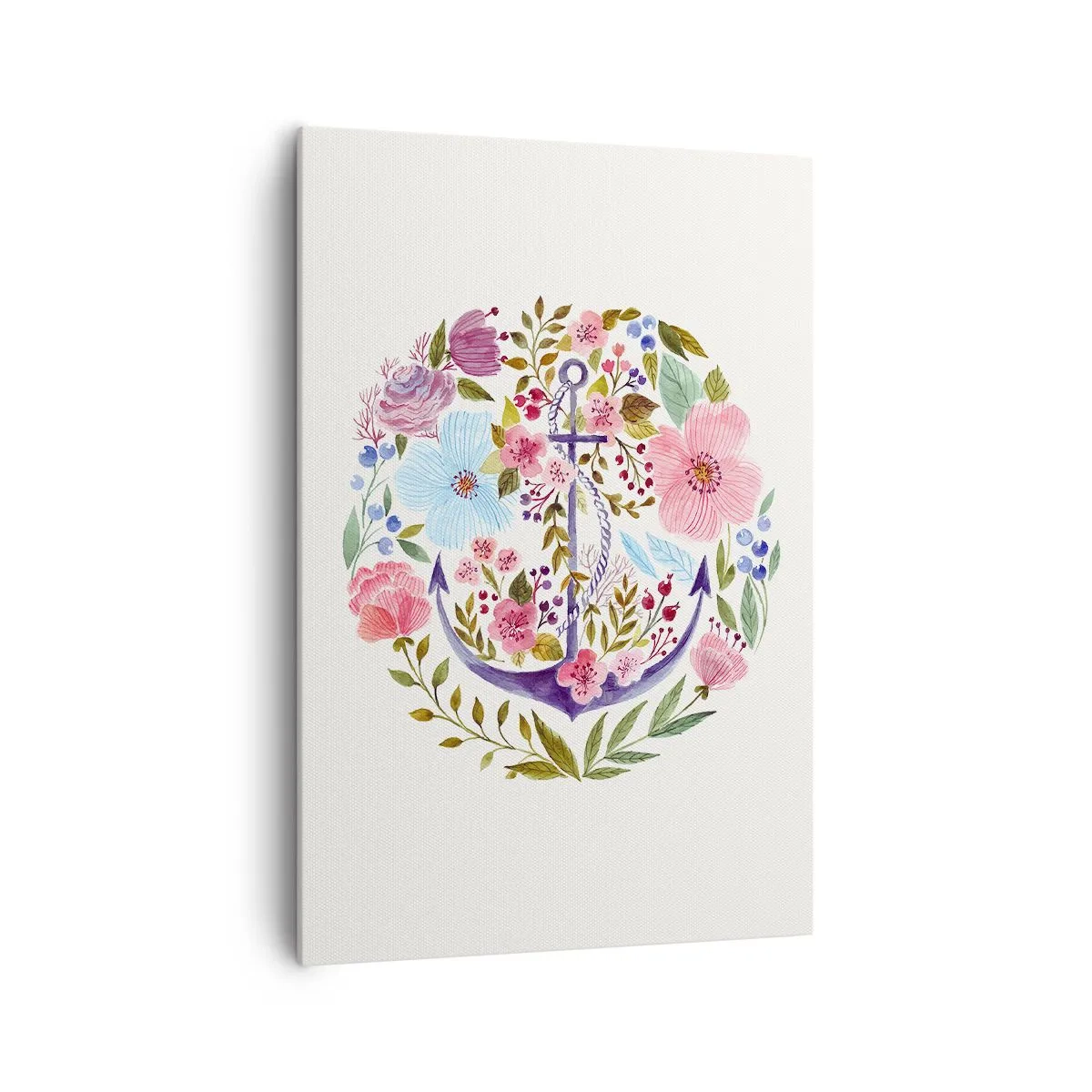 Obraz na płótnie - Kotwica otoczona kwiatami w akwarelowym stylu na jasnym tle - 70x100cm - Dobry sen żeglarza - Nowoczesna dekoracja ścienna do salonu i sypialni ARTTOR