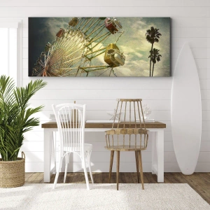 Obraz na płótnie - Retro fotografia diabelskiego młyna na tle chmur - 50x70cm - Będzie, będzie zabawa… - Nowoczesna dekoracja ścienna do salonu, kuchni i sypialni ARTTOR