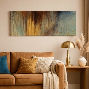 Obraz na płótnie - Abstrakcyjna kompozycja barw w odcieniach złota, brązu i błękitu - 100x70cm - Nieprzypadkowa barwna kompozycja - Nowoczesna dekoracja ścienna do salonu, kuchni i sypialni ARTTOR
