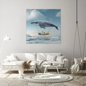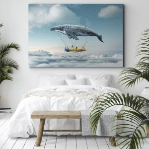 Obraz na płótnie - Latający wieloryb unoszący samolot w surrealistycznej scenerii - 120x50cm - Dlaczego nie? - Nowoczesna dekoracja ścienna do salonu i sypialni ARTTOR