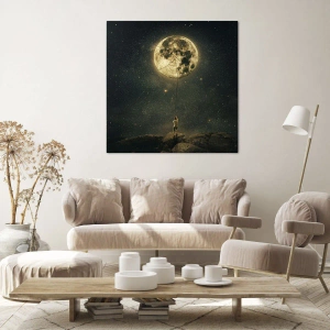 - Obraz przedstawiający człowieka trzymającego Księżyc na tle rozgwieżdżonego nieba. Artystyczna dekoracja wprowadzająca magię, spokój i wyobraźnię do wnętrza.