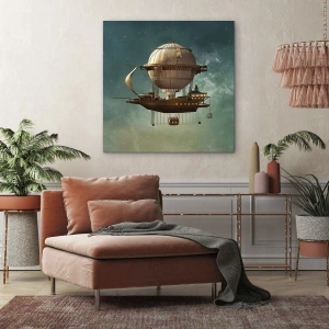 Obraz na płótnie - Fantastyczny sterowiec na tle zielonkawego nieba - 80x120cm - Juliusz Verne pozdrawia - Nowoczesna dekoracja ścienna do salonu i sypialni ARTTOR