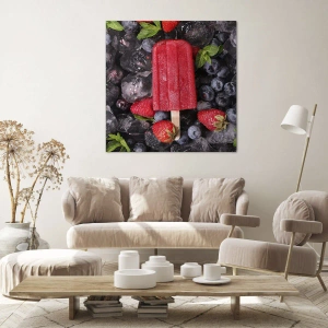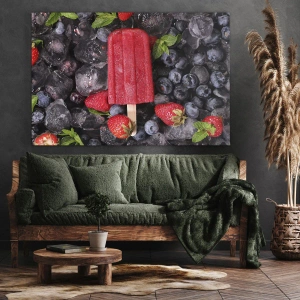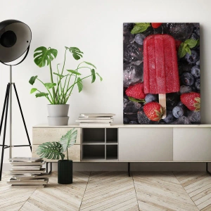 - Obraz przedstawiający czerwony lód na patyku w otoczeniu owoców i lodu. Kolorowa dekoracja wprowadzająca świeżość i letni klimat do wnętrza.