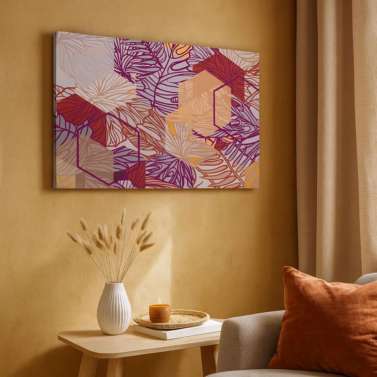 Obraz na płótnie "Związek niemozliwy geometrii i natury" to elegancka kompozycja, która przyciąga uwagę swoim tropikalnym motywem. Dekoracyjny wzór liści w odcieniach fioletu, pomarańczu i beżu tworzy harmonijną i dynamiczną całość, która wprowadza do wnętrza atmosferę egzotyki i wyrafinowania. Subtelne linie i delikatne kontury liści nadają obrazowi lekkości i wyjątkowego stylu, czyniąc go idealnym dodatkiem do wnętrz urządzonych w nowoczesnym i eklektycznym stylu.