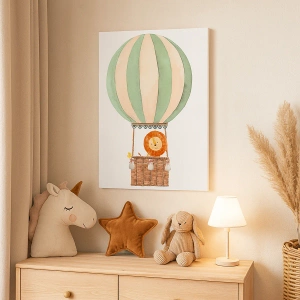 - Obraz przedstawia pastelowy balon z uśmiechniętym lwem w koszu, idealny jako dekoracja do pokoju dziecięcego.