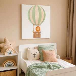Motyw balonu z lwem w koszu jest nie tylko zabawny, ale również inspirujący. Pastelowe kolory dodają delikatności i harmonii, dzięki czemu obraz świetnie komponuje się z jasnymi, przestronnymi wnętrzami. To dekoracja, która rozwija wyobraźnię, tworząc przytulny i przyjazny klimat w pokoju dziecka.