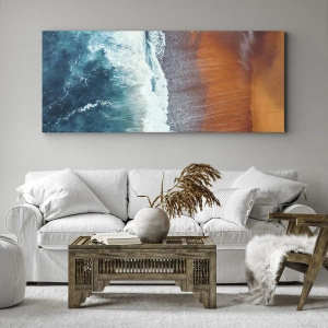 Dotyk oceanu to niezwykły obraz o wymiarach 70x50 cm, który uchwyca piękno natury w wyjątkowy sposób. Przedstawia fale oceanu rozbijające się o złocistą plażę, widziane z lotu ptaka. Ta artystyczna kompozycja zachwyca kontrastem między głębokim błękitem wody a ciepłym odcieniem piasku, tworząc harmonijny i inspirujący widok.
