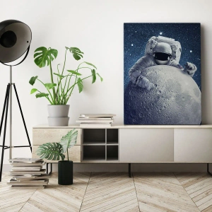 Obraz na płótnie - Astronauta trzymający księżyc na tle rozgwieżdżonego nieba - 80x120cm - Kosmiczny żartowniś - Nowoczesna dekoracja ścienna do salonu i sypialni ARTTOR
