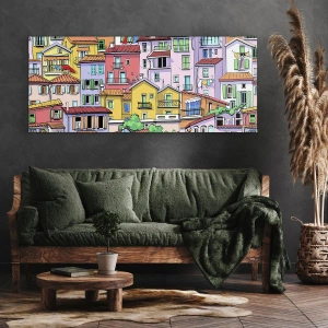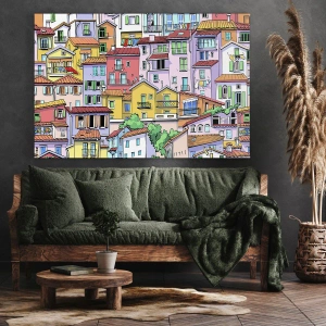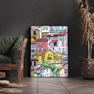 - Obraz przedstawia kolorowe kamienice w radosnej stylistyce. Żywa i wyrazista dekoracja, która wnosi energię i styl do każdego wnętrza.