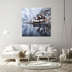 Obraz na płótnie - Zimowy widok na górską miejscowość nad jeziorem - 80x120cm - W zimowej dekoracji - Nowoczesna dekoracja ścienna do salonu i sypialni ARTTOR