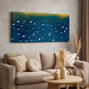 Artystyczny design obrazu doskonale oddaje harmonię pomiędzy naturą a ludzką aktywnością. Intensywny niebieski kolor wody kontrastuje z żółtymi odcieniami piasku, tworząc kompozycję pełną życia i wakacyjnego klimatu. Taka dekoracja to idealny wybór dla osób pragnących wprowadzić do swojego wnętrza świeżość i energię.