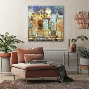 Obraz na płótnie - Abstrakcyjna kompozycja geometryczna w ciepłych i chłodnych odcieniach - 50x70cm - Słoneczna metropolia - Nowoczesna dekoracja ścienna do salonu, kuchni i sypialni ARTTOR