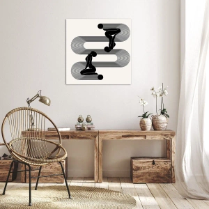 - Obraz przedstawiający czarne sylwetki z geometrycznymi liniami na jasnym tle, doskonały do nowoczesnych i minimalistycznych wnętrz.