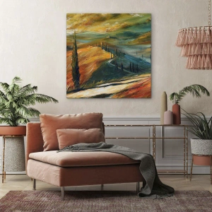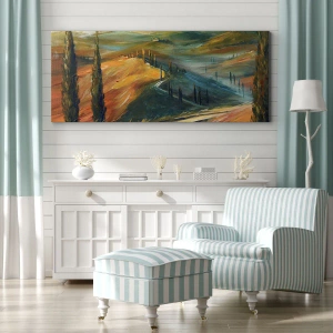 Obraz na płótnie - Toskański krajobraz z polami, drogą i cyprysami - 160x50cm - Toskański pejzaż - Nowoczesna dekoracja ścienna do salonu i sypialni ARTTOR