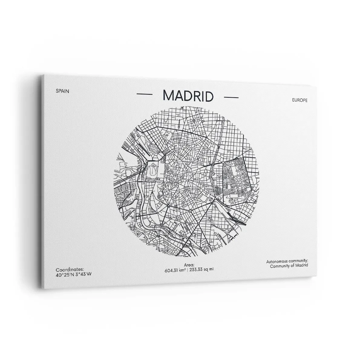 Obraz na płótnie - Mapa Madrytu w minimalistycznym, czarno-białym stylu - 100x70cm - Anatomia Madrytu - Nowoczesna dekoracja ścienna do salonu, kuchni i sypialni ARTTOR