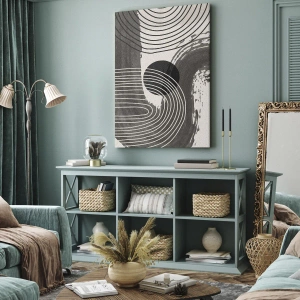 - Obraz z geometrycznymi liniami i owalami w monochromatycznych odcieniach to subtelna i elegancka dekoracja nowoczesnych wnętrz.