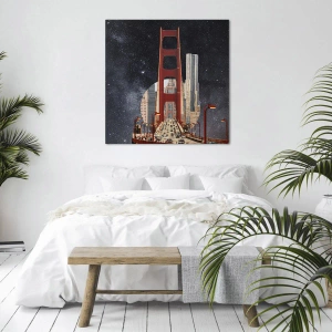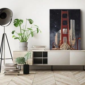 Obraz na płótnie - Most Golden Gate z miastem w tle na tle gwiaździstego nieba - 100x70cm - Zawsze w centrum - Nowoczesna dekoracja ścienna do salonu, kuchni i sypialni ARTTOR