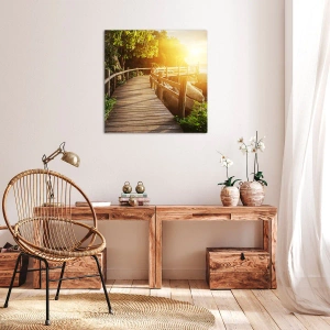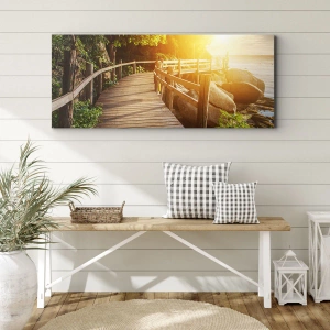- Obraz na płótnie z drewnianym pomostem wśród zieleni prowadzącym do morza w promieniach słońca. Idealny do wnętrz wprowadzających harmonię i spokój.