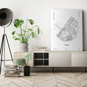 Obraz na płótnie - Minimalistyczna mapa Dubaju w czarno-białej kolorystyce z oznaczeniami lokalizacji - 80x120cm - Anatomia Dubaju - Nowoczesna dekoracja ścienna do salonu i sypialni ARTTOR