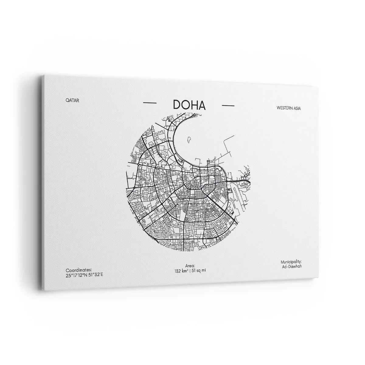 Obraz na płótnie - Minimalistyczna mapa Dohy w czarno-białej kolorystyce z precyzyjnymi detalami - 120x80cm - Anatomia Dohy - Nowoczesna dekoracja ścienna do salonu, kuchni i sypialni ARTTOR