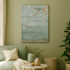 Motyw ten idealnie sprawdzi się w przestrzeniach takich jak salon, sypialnia czy przestrzeń relaksacyjna, wprowadzając do nich naturalny akcent. Obraz harmonijnie komponuje się z różnorodnymi stylami aranżacyjnymi, od klasycznego po boho, dodając wnętrzu ciepła i subtelności. Kwitnąca gałąź z ptakami symbolizuje odrodzenie, spokój i bliskość natury.
