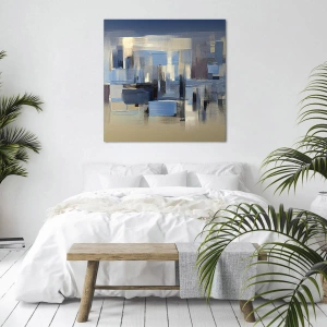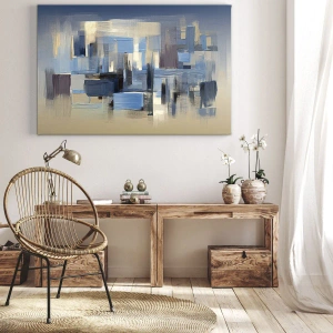"Błękitna konstrukcja" świetnie sprawdzi się jako dekoracja do salonu, biura lub sypialni. Dzięki swojej uniwersalnej stylistyce wprowadza do wnętrz nowoczesny charakter, a zarazem ciepło i harmonię. Obraz doskonale komponuje się z jasnymi przestrzeniami, podkreślając ich minimalistyczny styl.