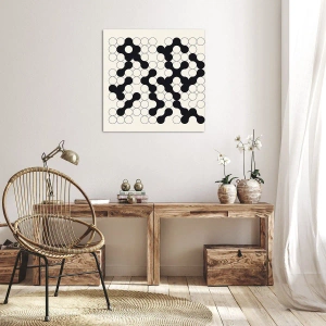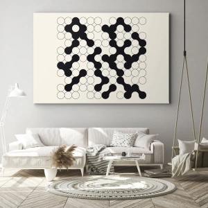 Obraz "Chińska gra – wariacja" to wyjątkowe dzieło sztuki, które wyróżnia się prostotą i nowoczesnym designem. Geometryczne wzory z czarnymi i białymi okręgami tworzą harmonijną kompozycję, która przyciąga uwagę i dodaje wnętrzu elegancji. Minimalistyczna estetyka sprawia, że obraz ten doskonale pasuje do współczesnych aranżacji wnętrz.