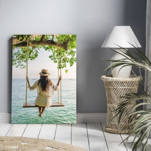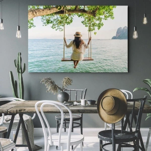 Obraz na płótnie - Kobieta na huśtawce nad morzem w tropikalnym krajobrazie - 120x80cm - Życie jest piękne - Nowoczesna dekoracja ścienna do salonu, kuchni i sypialni ARTTOR