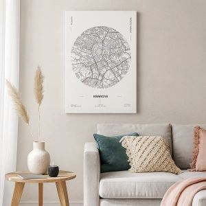 - Obraz przedstawiający minimalistyczną mapę Krakowa w czarno-białej kolorystyce. Idealny dla miłośników urbanistyki i nowoczesnego designu.