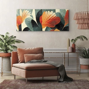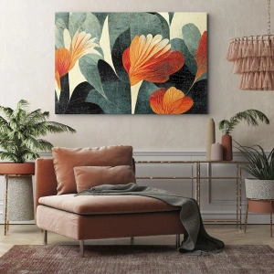 - Obraz przedstawiający kwiaty w intensywnych odcieniach pomarańczu i zieleni, na tle naturalnych motywów. Wyrazista i elegancka dekoracja idealna do nowoczesnych wnętrz, takich jak salon, sypialnia czy biuro.