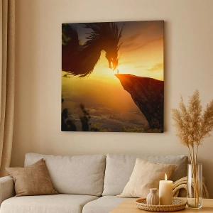 Obraz na ścianę - Pogromca smoka - Smok i człowiek na skale w blasku zachodzącego słońca