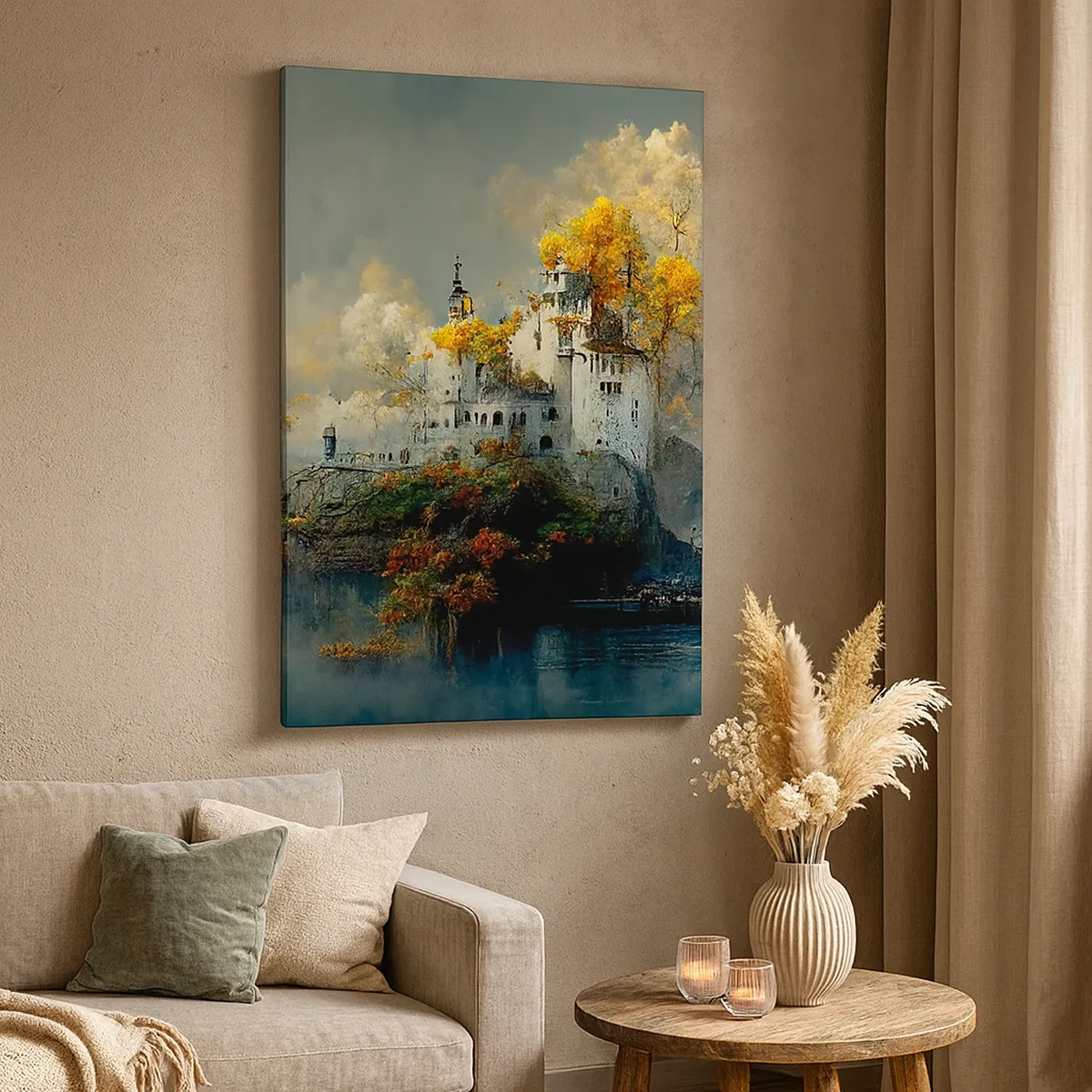 Obraz na płótnie - Zamek na wzgórzu otoczony jesiennymi drzewami - 80x120cm - Początek romantycznej opowieści - Nowoczesna dekoracja ścienna do salonu i sypialni ARTTOR