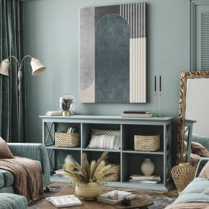 Obraz na płótnie - Geometryczna abstrakcja w odcieniach szarości i zieleni - 70x100cm - Kompozycja na poziomie - Nowoczesna dekoracja ścienna do salonu i sypialni ARTTOR