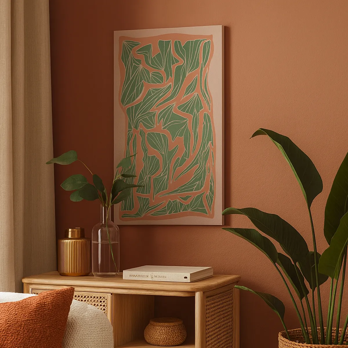 Obraz na płótnie - Stylizowane liście na tle w odcieniach koralu i beżu - 50x70cm - Zmagania koralu i zieleni - Nowoczesna dekoracja ścienna do salonu, kuchni i sypialni ARTTOR
