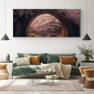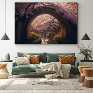 Obraz na płótnie - Tradycyjny japoński most otoczony kwitnącymi wiśniami - 120x80cm - Japońska wiosna - Nowoczesna dekoracja ścienna do salonu, kuchni i sypialni ARTTOR