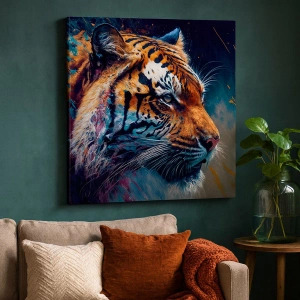 Obraz na płótnie - Artystyczna interpretacja tygrysa w dynamicznych barwach z abstrakcyjnym tłem - 50x70cm - Dzikie piękno - Nowoczesna dekoracja ścienna do salonu, kuchni i sypialni ARTTOR
