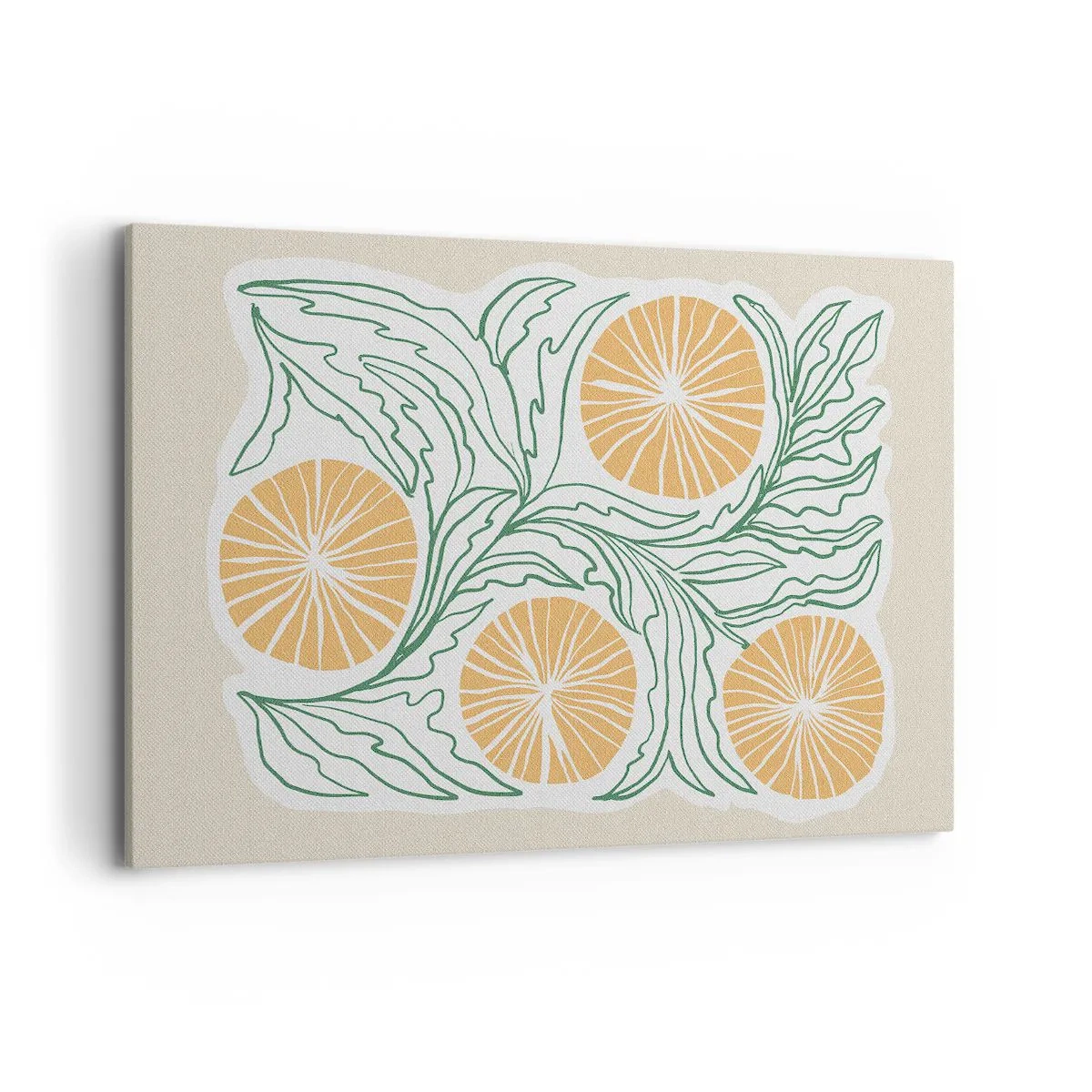 Obraz na płótnie - Minimalistyczny motyw pomarańczy z zielonymi liśćmi - 120x80cm - Etnicznie z nutą abstrakcji - Nowoczesna dekoracja ścienna do salonu, kuchni i sypialni ARTTOR