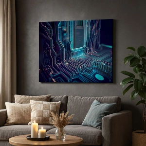 Obraz na płótnie - Technologiczna płytka drukowana z podświetlonymi ścieżkami - 80x120cm - Tak sobie myślę… - Nowoczesna dekoracja ścienna do salonu i sypialni ARTTOR