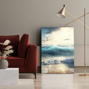 Obraz na płótnie - Morskie fale na plaży pod błękitnym niebem z mewami - 120x80cm - Szumi tylko dla ciebie - Nowoczesna dekoracja ścienna do salonu, kuchni i sypialni ARTTOR