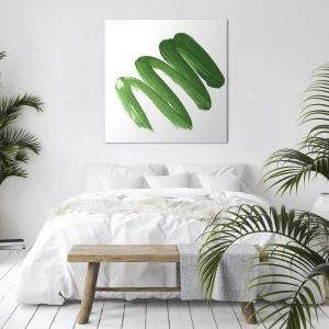 Obraz doskonale wpisuje się w estetykę współczesnej sztuki, gdzie liczy się kontrast i wyrazistość. Zielony kolor symbolizuje naturę, harmonię i energię, a białe tło podkreśla jego intensywność, nadając całości nowoczesnego charakteru.