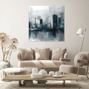 Obraz na płótnie - Nowoczesne miasto w odcieniach turkusu i szarości - 80x120cm - Miasto w kolorze deszczu - Nowoczesna dekoracja ścienna do salonu i sypialni ARTTOR